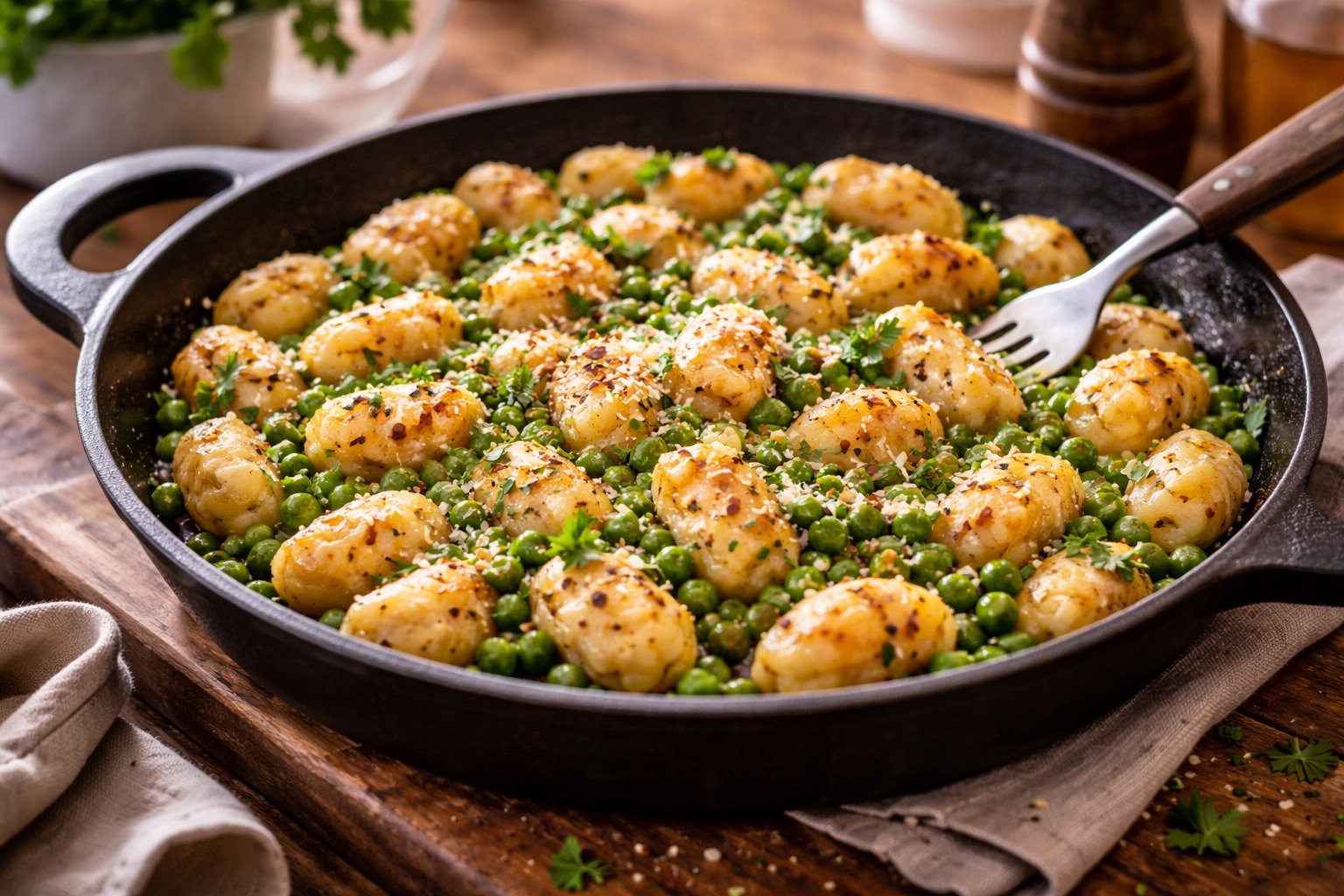 Fast comfort meal: golden pan-seared gnocchi tossed in garlic butter with sweet peas and Parmesan. Ready in minutes.