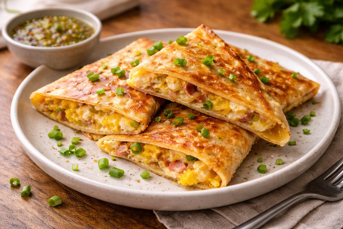 Crispy, cheesy egg quesadilla with salsa verde and a little heat—fast, filling, and perfect for a no-fuss breakfast.