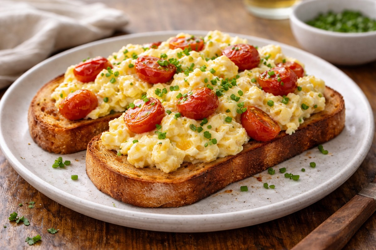 Fluffy eggs blended with cottage cheese turn extra creamy, finished with juicy tomatoes and chives for a fast, satisfying breakfast you’ll want on repeat.