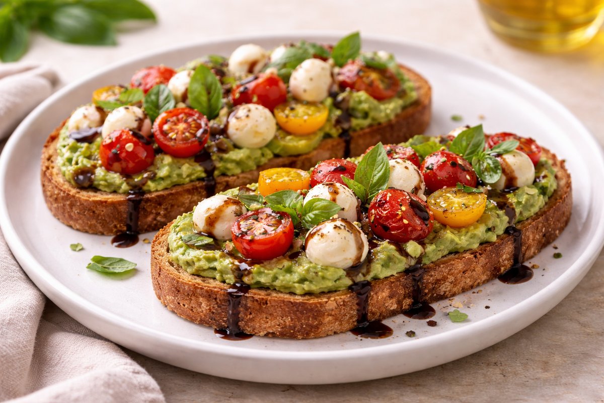 Creamy avocado toast topped with juicy tomatoes, fresh mozzarella, basil, and a sweet balsamic drizzle—fast, fresh, and filling.
