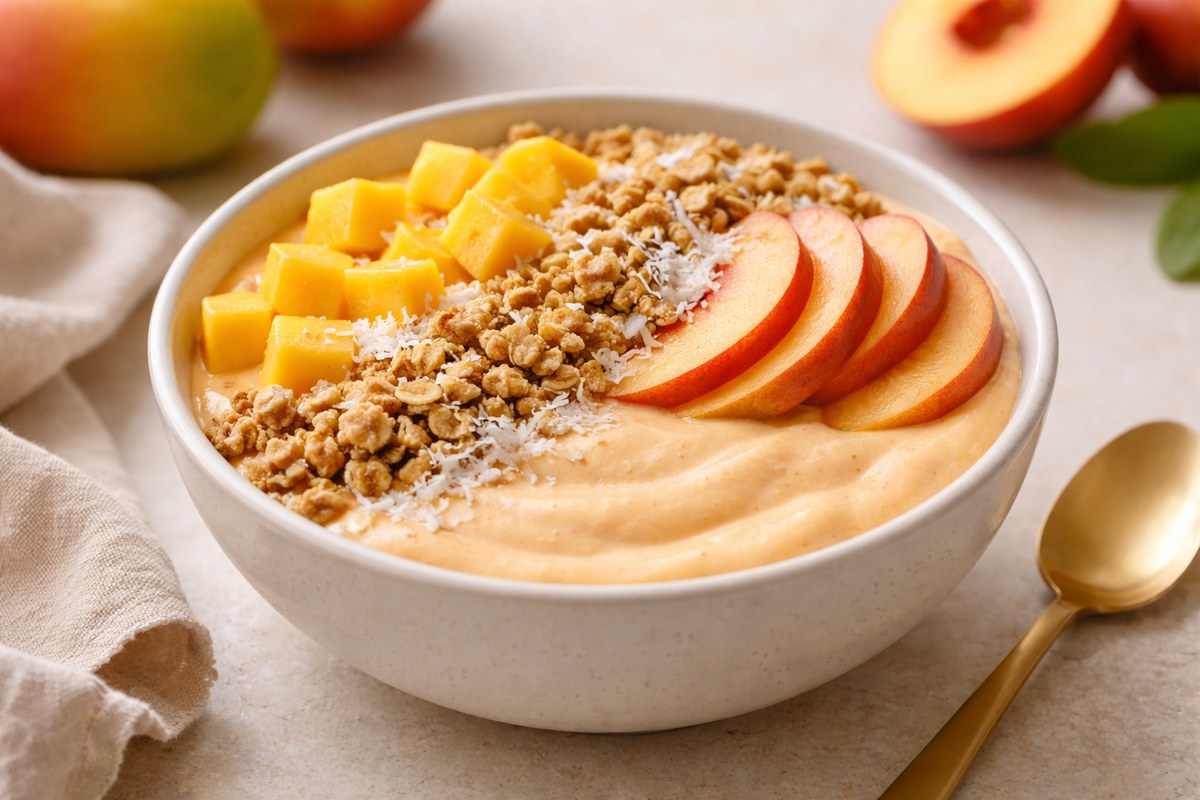 Thick peach-mango protein smoothie bowl with creamy yogurt and crunchy toppings—5-minute breakfast that feels like a treat but keeps me full.