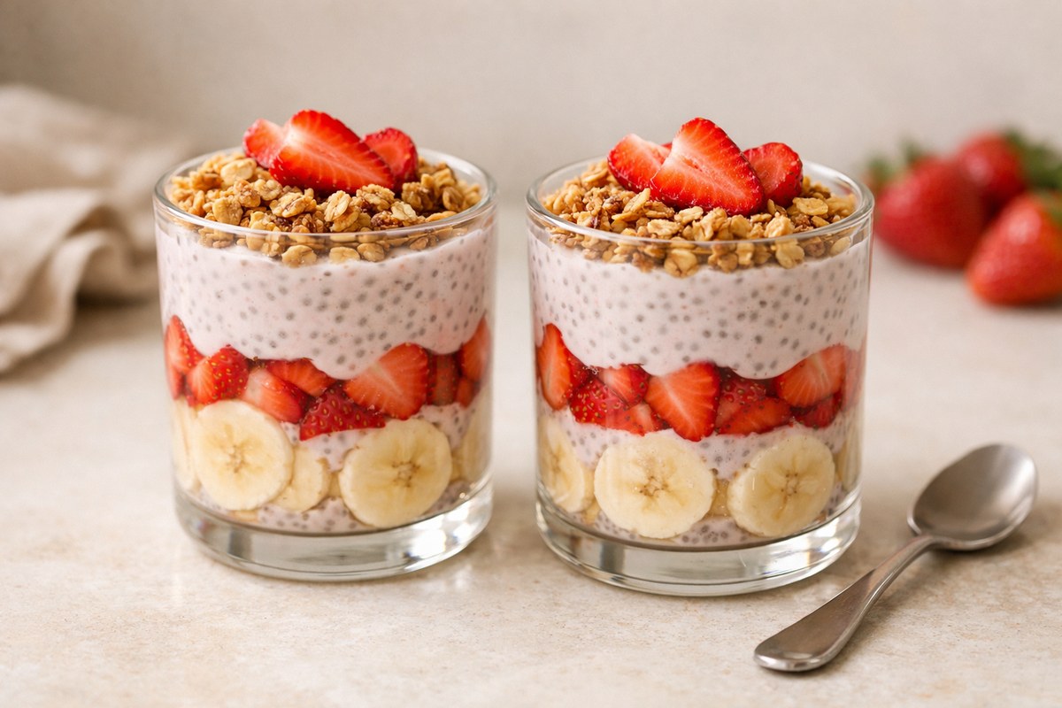 Creamy strawberry-banana chia pudding parfaits are a no-cook, make-ahead breakfast with bright fruit, protein, and the perfect crunchy topping.