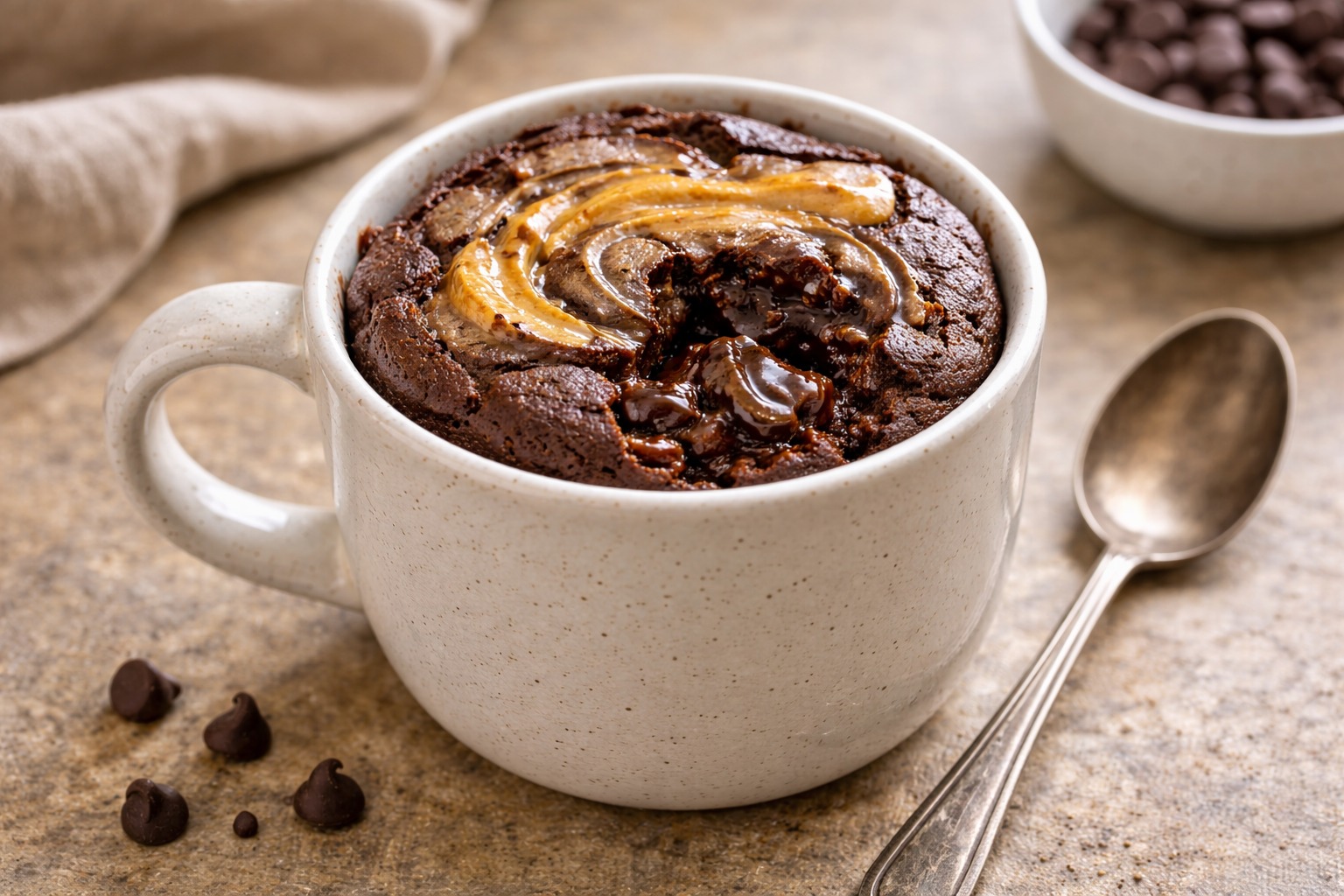 A warm microwave mug cake with a gooey chocolate center and peanut butter swirl—ready in 6 minutes with simple pantry staples.
