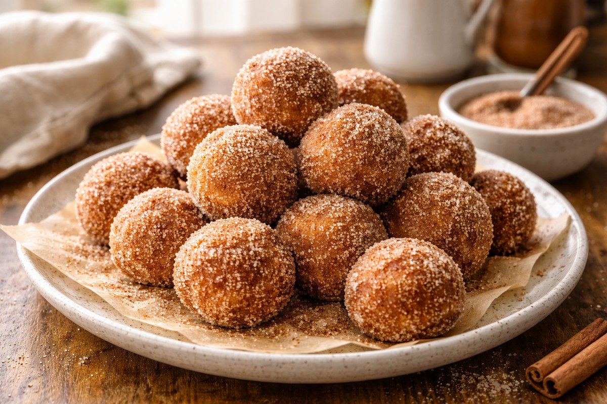 Warm, fluffy donut holes made from biscuit dough in the air fryer, coated in melted butter and cinnamon sugar—fast, fun, and dangerously snackable.
