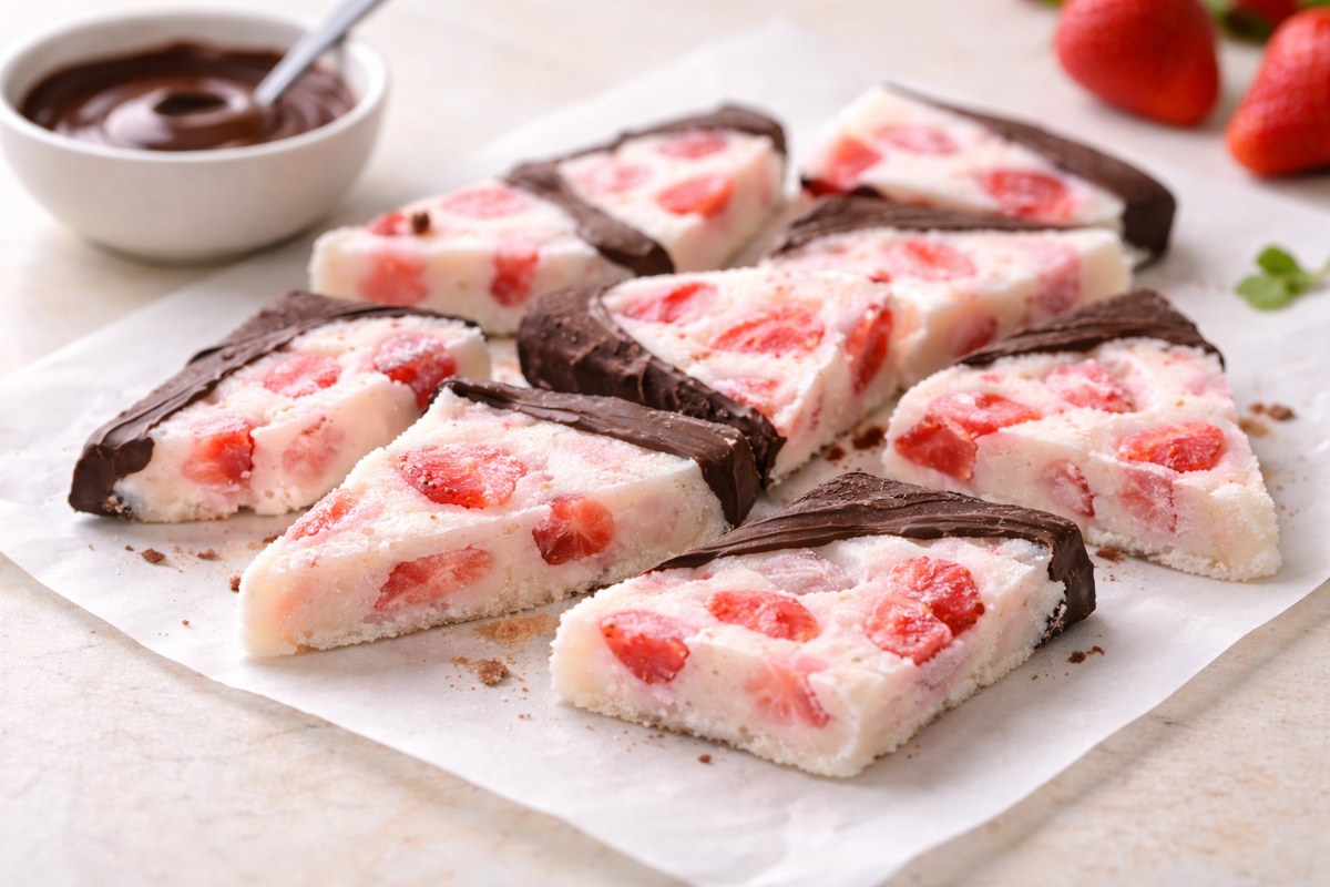 Frozen strawberry yogurt bark with a thin chocolate dip—easy, refreshing dessert that’s sweet, crunchy, and perfect for snacking straight from the freezer.