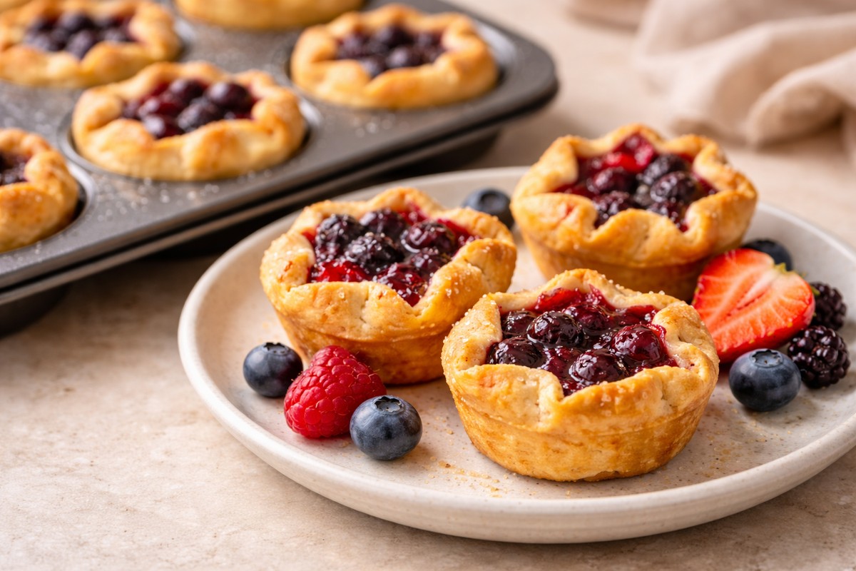 Mini mixed berry galette cups with flaky crust and juicy filling—an easy dessert that looks fancy but comes together fast.