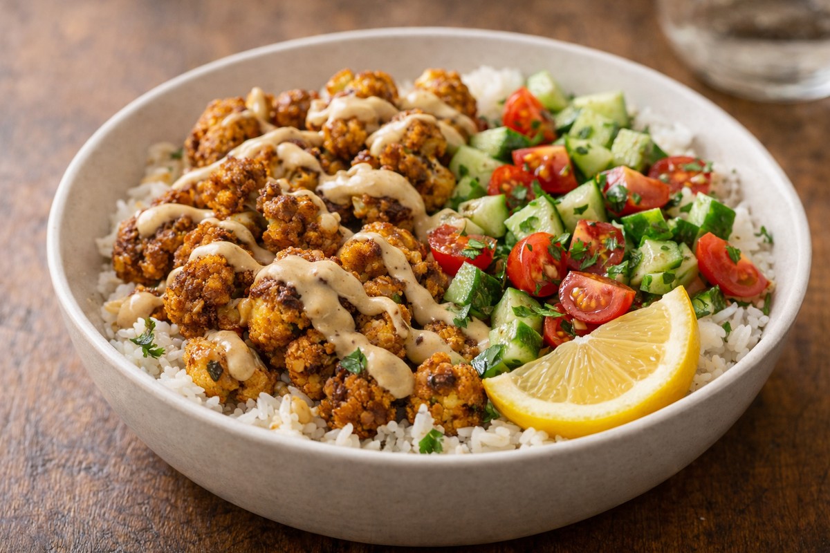 Spiced roasted cauliflower shawarma bowls with a crunchy cucumber-tomato salad and lemon tahini drizzle—fresh, filling, and meal-prep friendly.