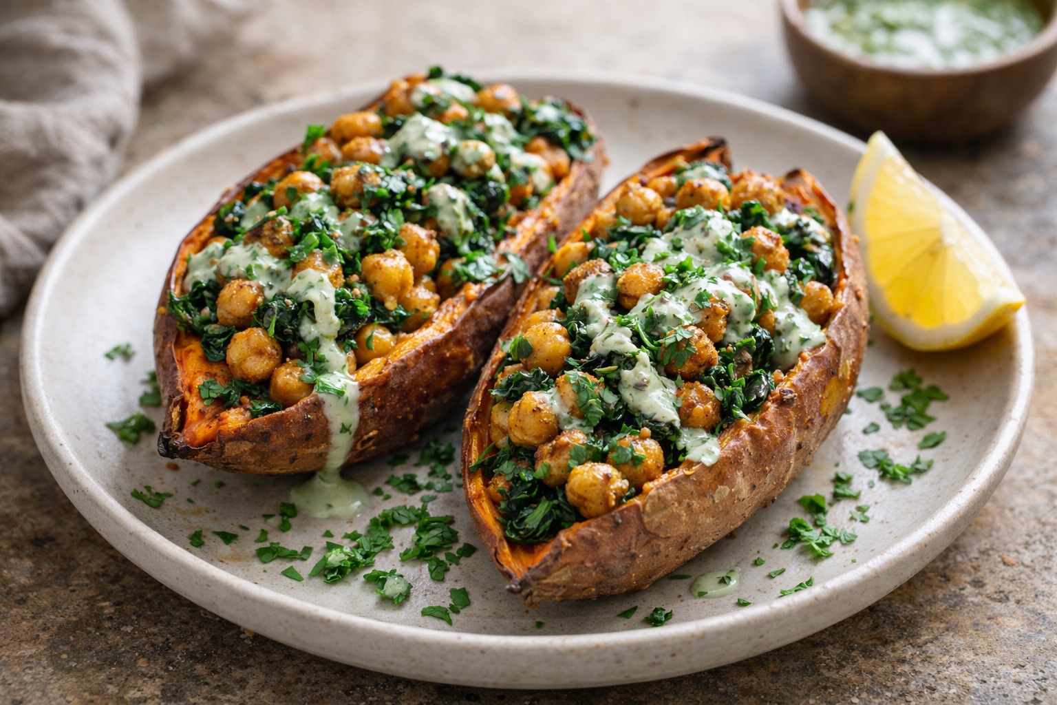 Roasted sweet potatoes filled with spiced chickpeas, greens, and a lemony tahini herb drizzle—simple, hearty, and balanced.