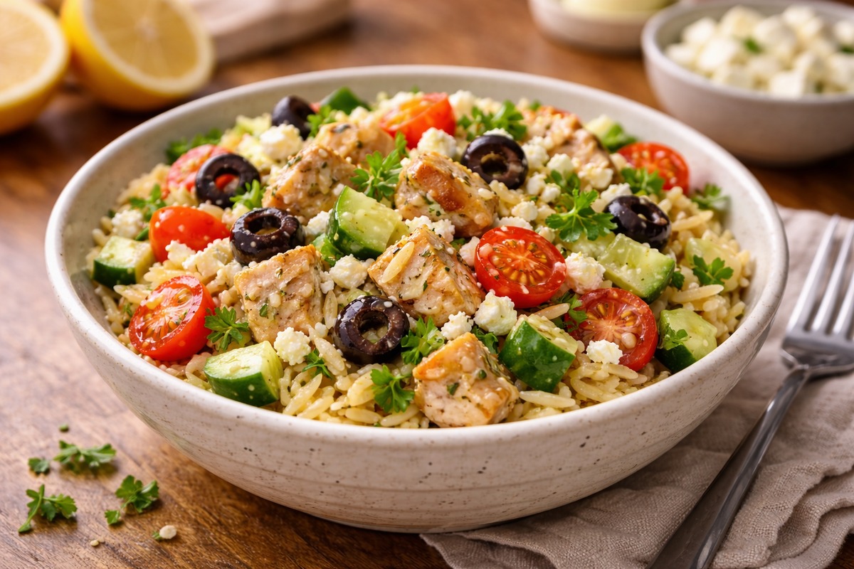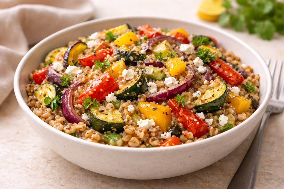 A hearty, meal-prep lunch with chewy farro, sweet roasted veggies, salty feta, and a bright lemon-oregano vinaigrette.
