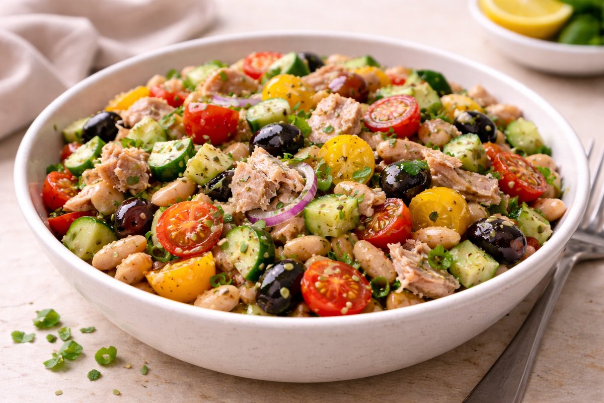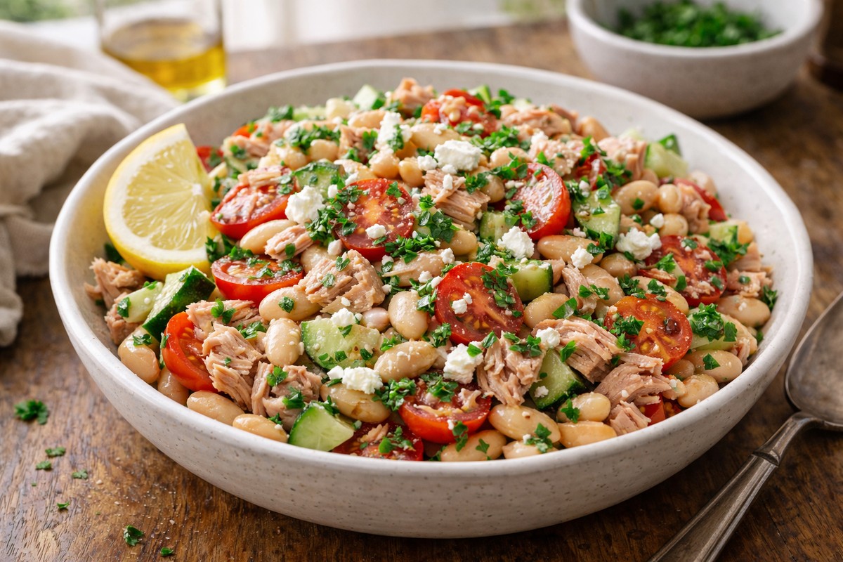 A bright, protein-packed tuna salad with white beans, crunchy veggies, lemon, and olive oil—no mayo, perfect for meal prep.