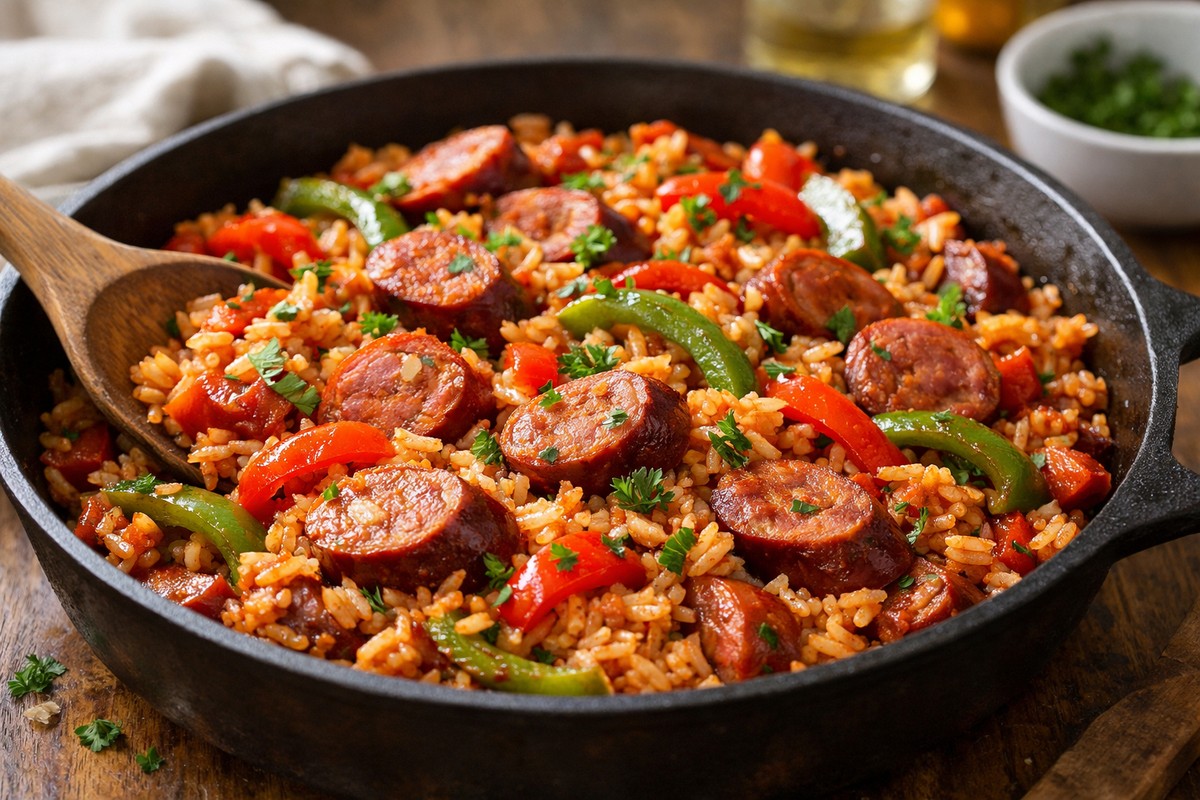 Smoky sausage, sweet peppers, and quick rice get tossed in a bold Cajun-style tomato sauce—an easy one-pan meal that tastes like it cooked much longer.