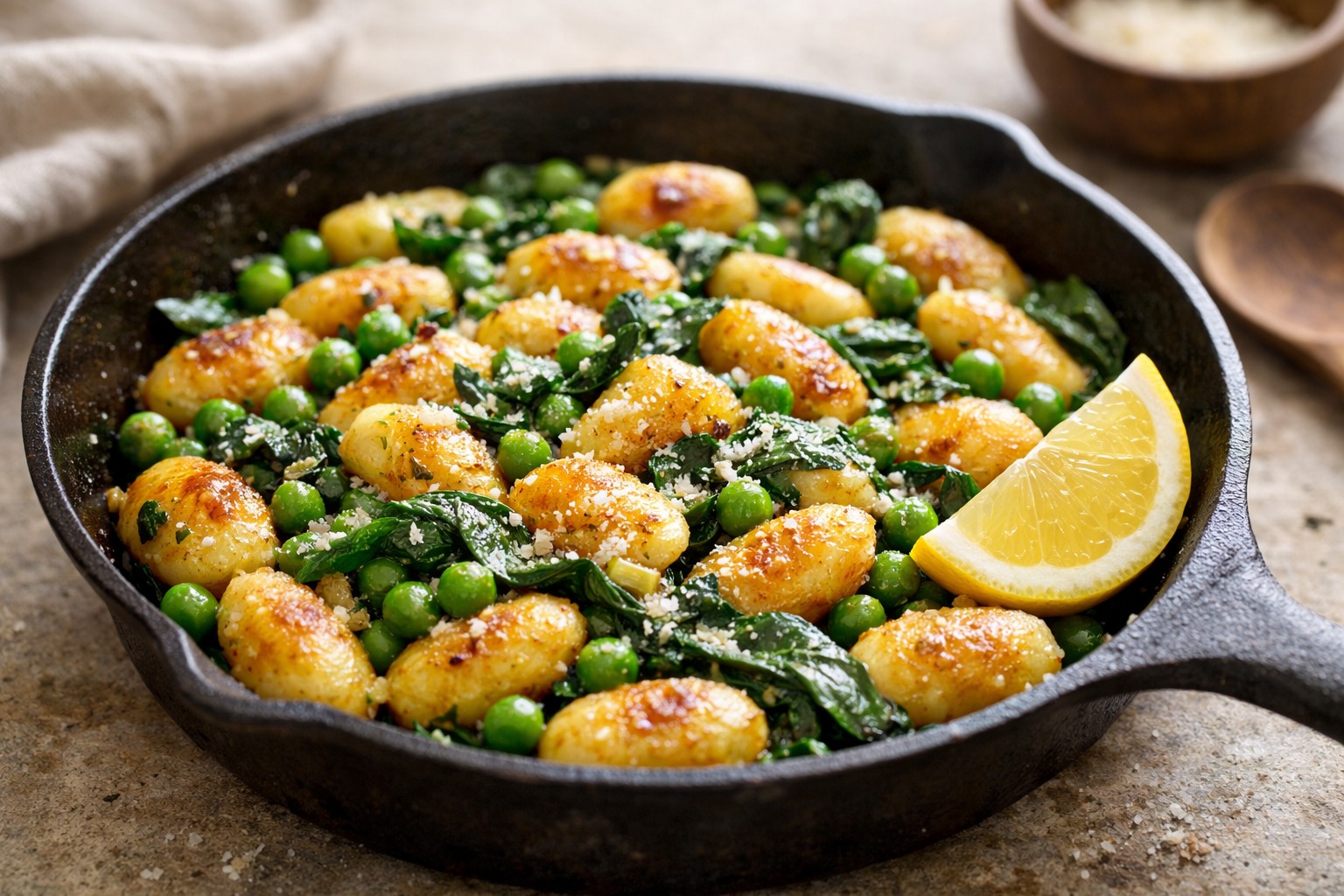 Crispy-tender gnocchi tossed in garlic butter with peas, spinach, and Parmesan—one pan, comfort food, done in 12 minutes.
