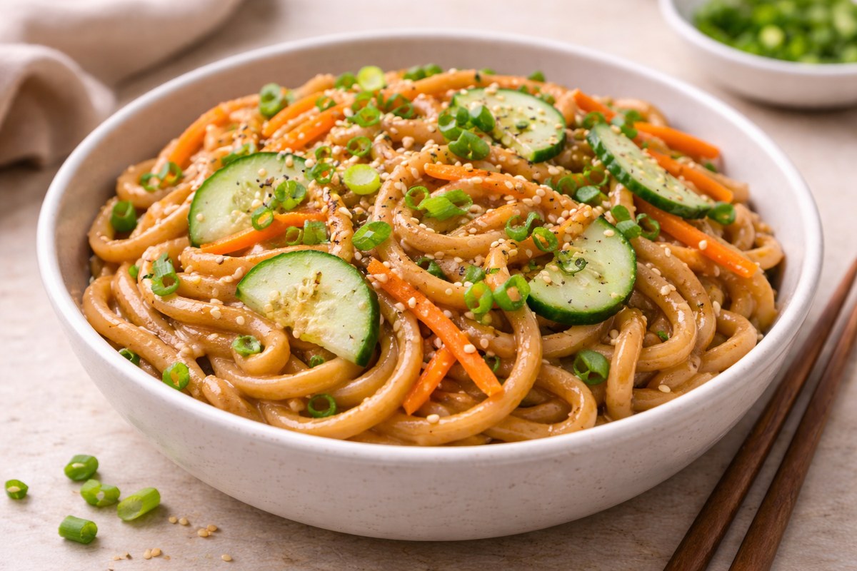 Fast udon noodles tossed in a creamy spicy peanut sauce with crunchy veggies—better than takeout and ready in 15 minutes.