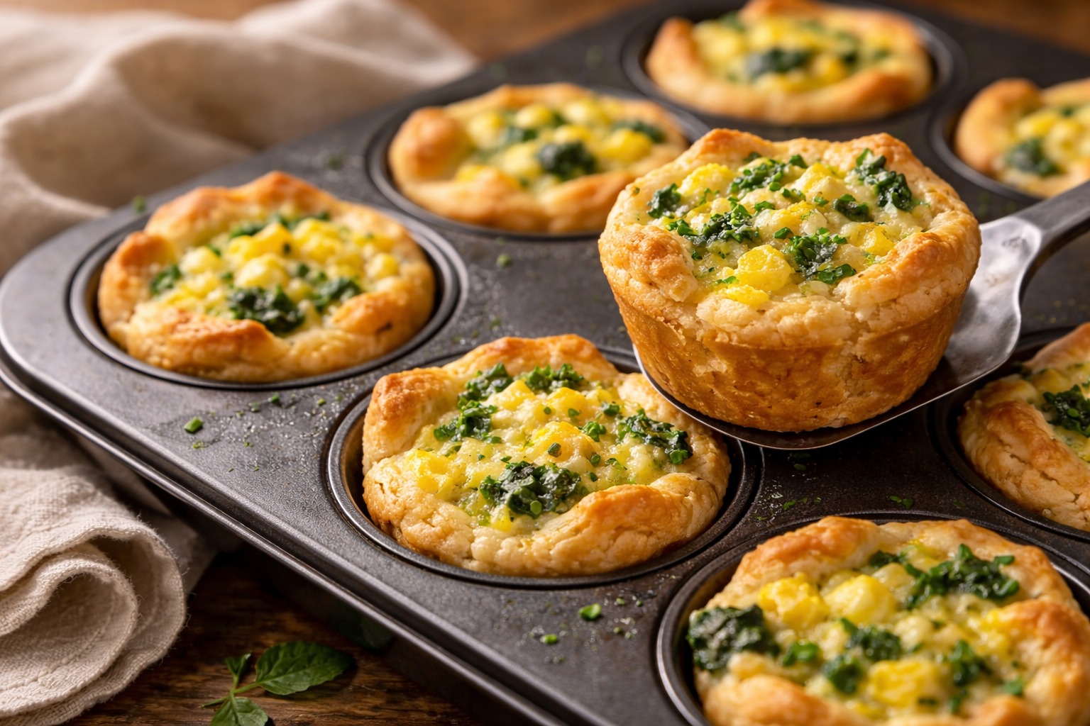 Some mornings I want a hot breakfast that feels comforting, but I don’t want to stand at the stove making individual sandwiches. These Cheesy Spinach Breakfast Biscuit Cups solve that problem in the simplest way: pop-open biscuit dough becomes a flaky little cup, and the filling is a quick mix of eggs, spinach, and cheese. They bake all at once, come out golden, and are easy to grab on the way out the door.