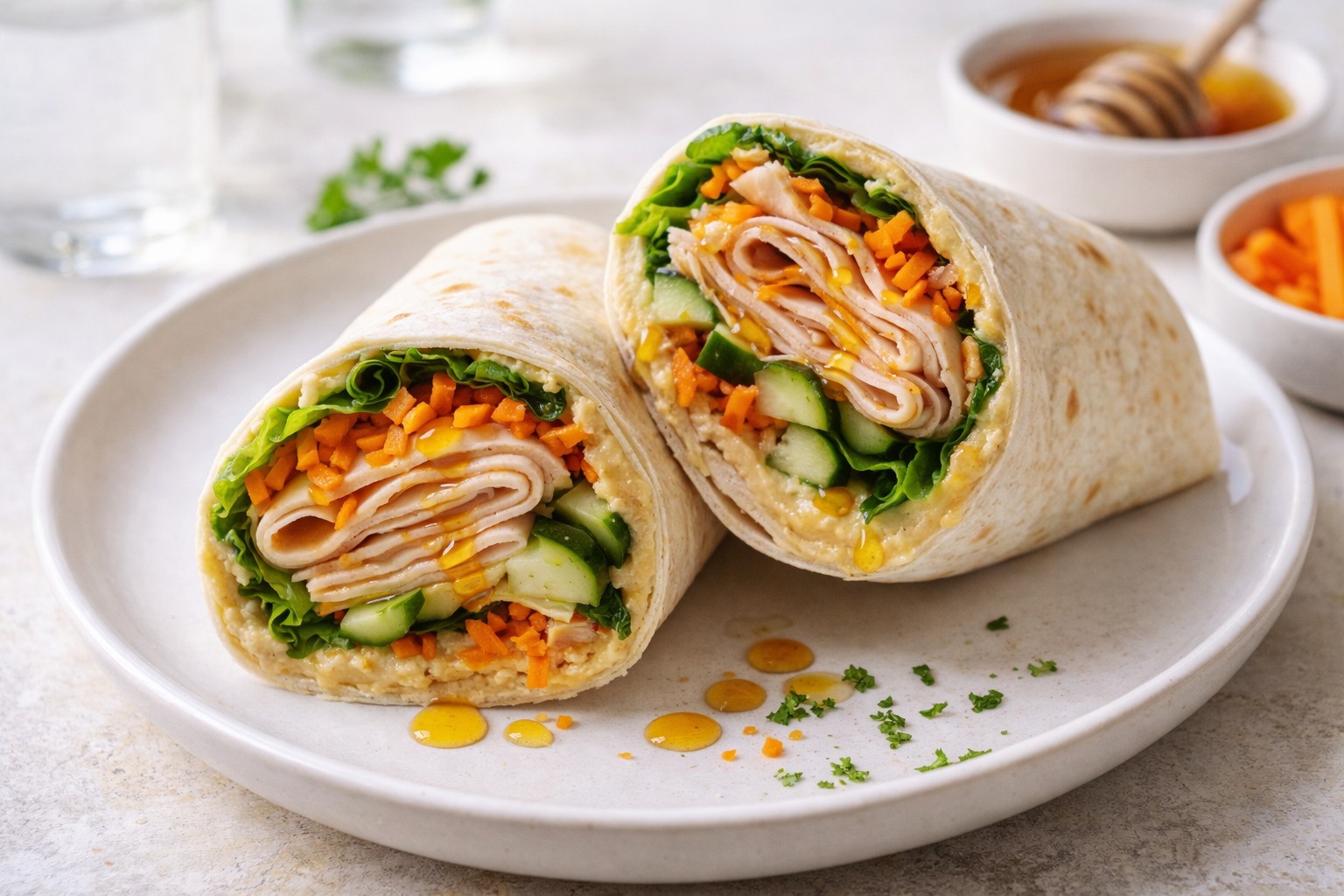 The combination is simple, but it works. Turkey gives the wrap a solid protein base, hummus adds creaminess and flavor, and shredded lettuce plus cucumbers keep every bite crisp. The hot honey is what changes the whole feel of the lunch. It adds a little kick and just enough sweetness to make the savory ingredients pop without overwhelming them.