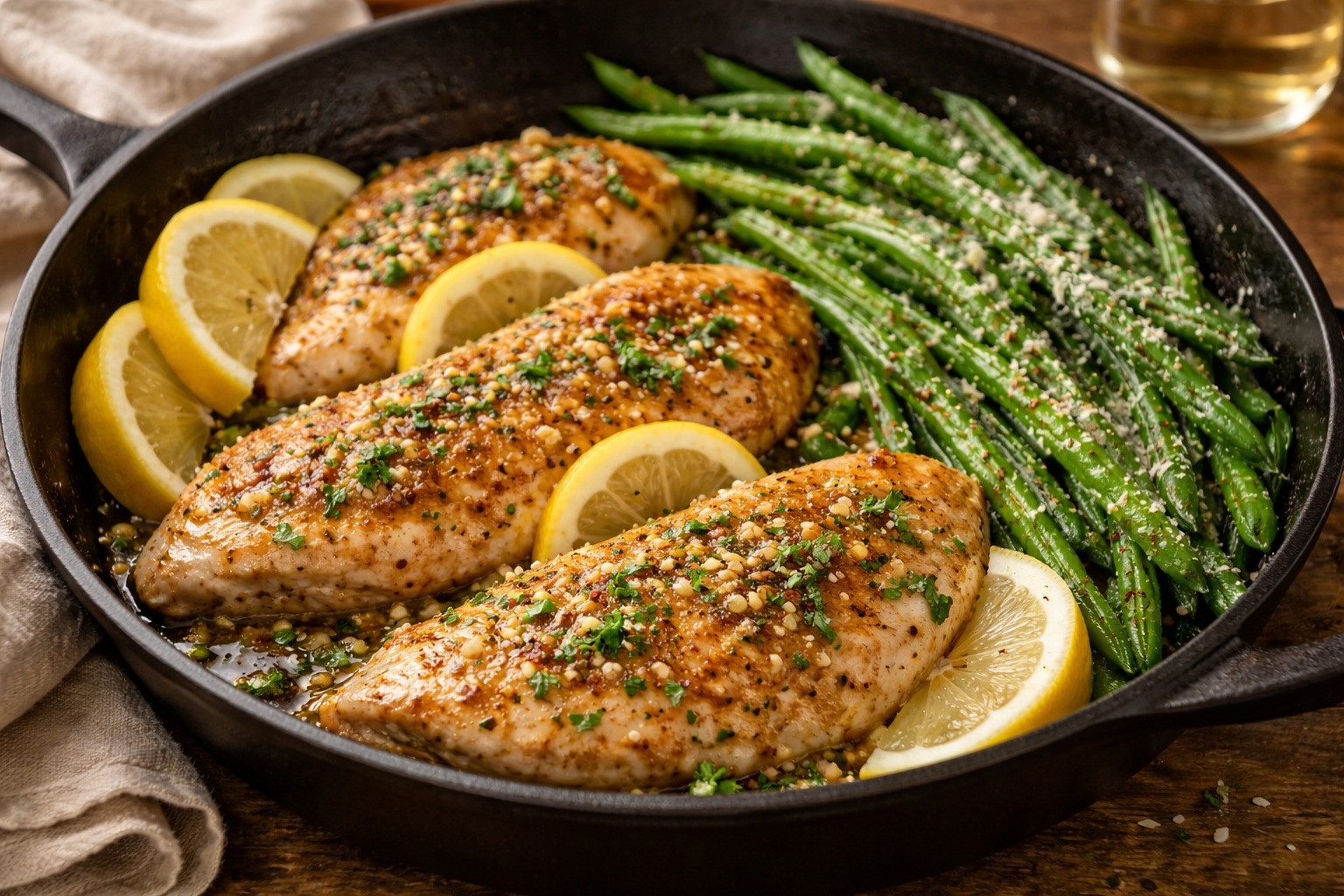 Juicy lemon-garlic chicken cooked in one skillet with Parmesan green beans and a bright pan sauce. Easy, fresh, and weeknight-friendly.