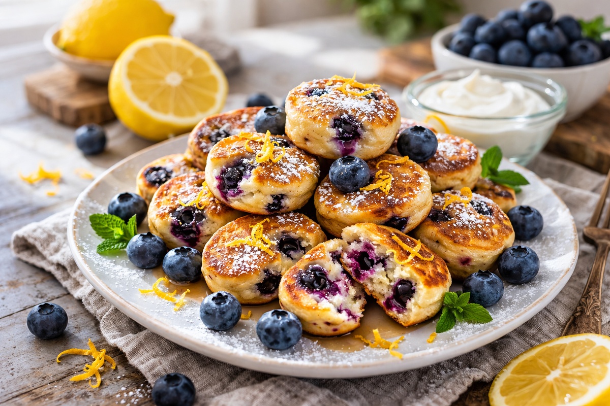 Bright lemon-blueberry pancake bites bake in a mini muffin tin for an easy, fluffy breakfast you can grab and go.