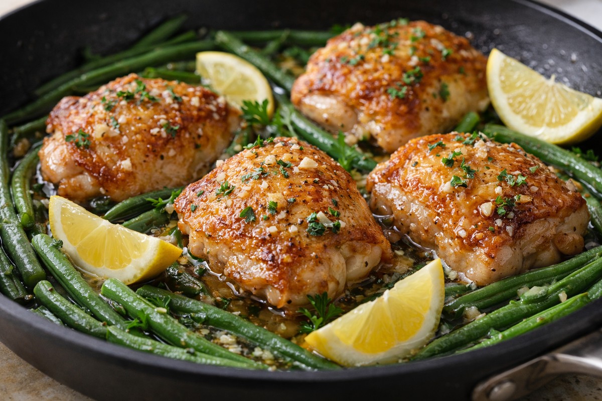 Crispy-skinned chicken thighs roast in a garlicky butter sauce with green beans for a simple one-pan dinner everyone loves.