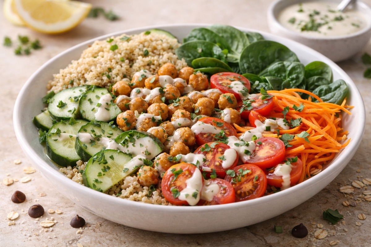 This quinoa chickpea power bowl is fresh, filling, and topped with a creamy tahini-lemon dressing you’ll want to put on everything.