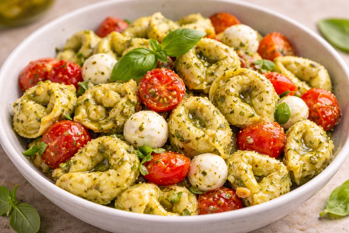 Pesto tortellini with tomatoes and mozzarella is my 10-minute dinner when I need comfort food ASAP.