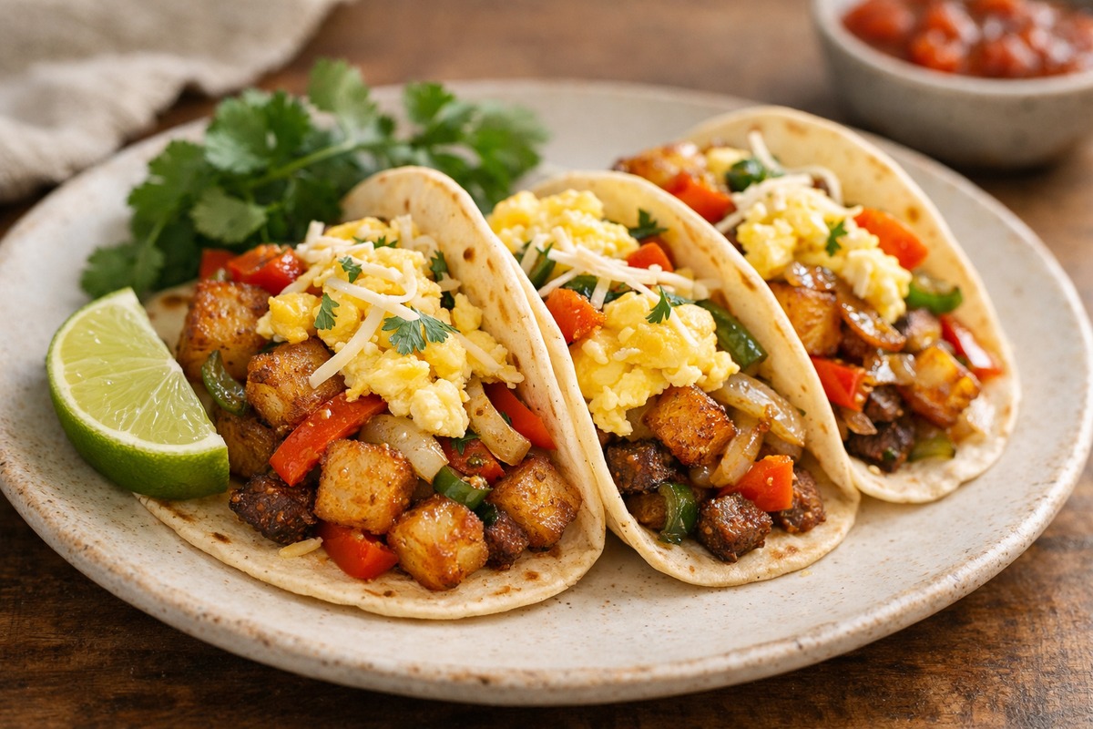 Skillet-crispy potatoes, peppers, and fluffy eggs make these breakfast tacos the kind of morning you actually look forward to.
