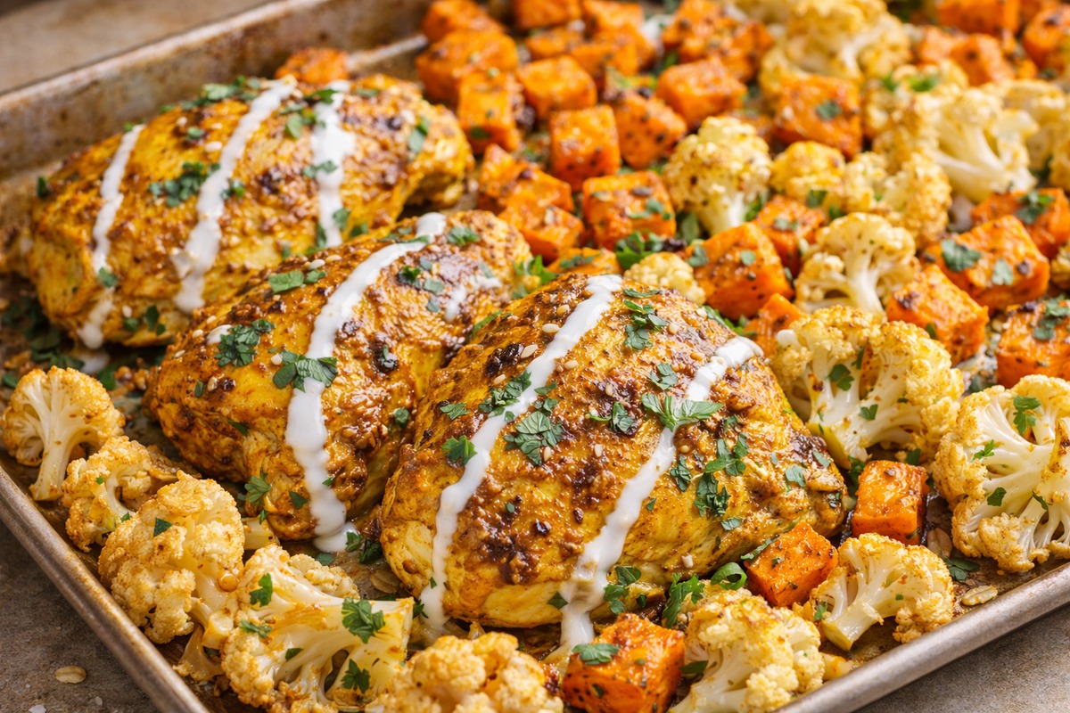 Turmeric sheet pan chicken with roasted veggies and yogurt drizzle is my healthy dinner that doesn’t taste “diet.”