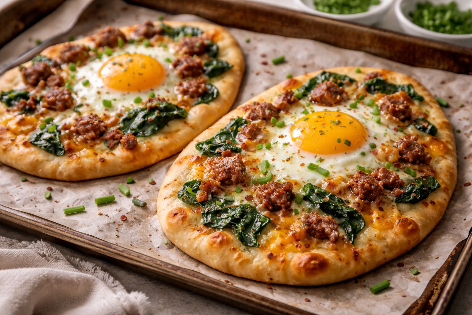 Using naan as the base makes everything easier. You do not need to make dough, you do not need to shape anything, and the texture comes out especially good. The edges get lightly crisp, the middle stays tender, and it holds toppings really well. With eggs, sausage, spinach, and cheese, you get a breakfast that feels warm, hearty, and balanced all at once.