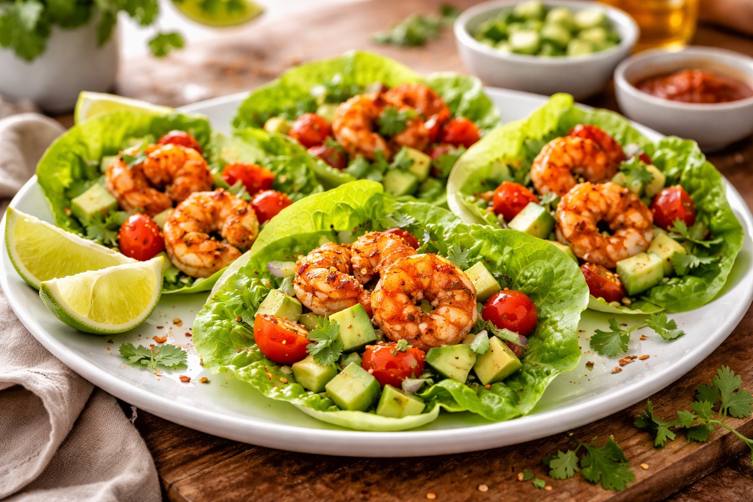 - Fill lettuce leaves with the avocado salad and top with shrimp. Add extra lime if desired.